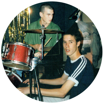 Itay sits on his first drum kit, Omri on his piano